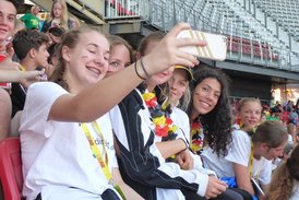 Am Fr. 17.6. ging es dann gleich mit der weiteren Herausforderung los. Der Spielbeginn des ersten Gruppenspiels war um 9:00 Uhr in einer ca. 20 Min. entfernten Halle angesetzt. Die Mädels waren verständlicherweise noch nicht im „beschleunigten“ Modus, so dass wenig Zeit für eine mentale Vorbereitung zwischen dem Aufstehen von einer Isomatte über die Einnahme eines dürftigen Frühstücks bis hin zur ersten Annahme auf dem Feld verblieb. Trotzdem haben sich die 12 Spielerinnen, die für das 1. Spiel aufgestellt wurden tapfer gegen die tschechischen U17 Spielerinnen gewehrt. Dass sie damit auch gleich gegen den Gruppengegner 0:2 verloren, der dann später souverän im Finale stand und Zweiter wurde, war einfach Los-Pech. Das 2. Spiel folgte mit anderer Besetzung um 11:00 Uhr und konnte auf Grund guter Aufschläge und einer sensationellen Abwehrarbeit gegen sehr große (bis zu 1,92 m) Holländerinnen 2:0 gewonnen werden. Damit war der Anfang der Gruppenphase gemacht und es ging in die Arena zum Mittag, bei dem man aus einer große Auswahl wählen konnte und was recht gut schmeckte. An dem Tag war dann für das Team kein Spiel mehr und das Freizeitangebot am Campingplatz wurde genossen, bevor man sich für die Eröffnungsfeier im Stadion präparierte.
