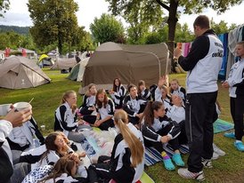 Am Do. 16.6. Vormittag trafen sich 16 von den angemeldeten 17 Auswahlspielerrinnen in Lohhof und Rosenheim um das Abenteuer in Angriff zu nehmen. Eine Spielerin folgte am Fr. Nachmittag mit dem Zug. Nach einer staulosen Fahrt in 3 Kleinbussen kam man in Klagenfurt bei der Arena (Players Town) zur Anmeldung an. Nach kurzen Formalitäten ging es zu dem wunderbar, am Wörthersee gelegenen Campingplatz und es dauerte gar nicht so lang bis alle 6 Zelte standen. Hier taten sich die technisch versierten Mädels hervor. Daraufhin erhielten die Mädels ihre Sonderaufgabe für diese Fahrt: sie mussten 10 unterschiedliche Nationalhymnen von anderen Teams durch mindestens vier Sänger(innen) dem Trainerstab vorsingen zu lassen. Die folgende Freizeit wurde dann gleich genutzt um das Strandbad zu erkunden, Nationalhymnen-Sänger zu finden und in den See zu springen. Leider konnte uns der Ausrichter keine Trainingshalle für Do. Abend ermöglichen, so dass ein 20 Minuten Spaziergang zum Italiener als einzige sportliche Komponente an dem Tag herhalten musste. Das Essen war lecker und nach dem kurzen Rückweg gingen alle frisch geduscht und nichts ahnend schlafen. Es folgte eine Nacht, die so schnell niemand vergisst und vielen den Schlaf raubte. 3 unterschiedliche Gewitter tobten ab 2:00 Uhr gleichzeitig um Klagenfurt, Regen drang leider in die Vorräume von 3 Zelten ein und setzte ein paar Taschen unter Wasser. In den frühen Morgenstunden war wieder Ruhe und man fand seinen Schlaf.