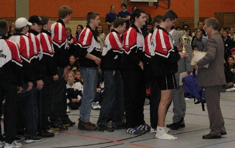 Die B-m marschierte souverän durch die Begegnungen. Bei der Siegerehrung erhält Gerrit Zeitler den Pokal überreicht vom Präsidenten des BVV, Eberhardt Greif, und vom Sportwart Dieter Fiedler.