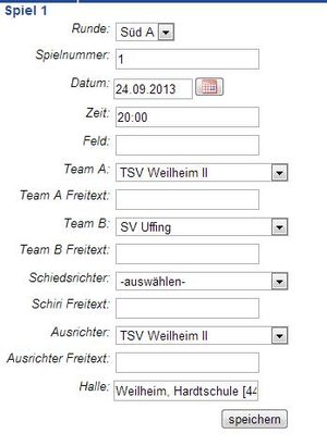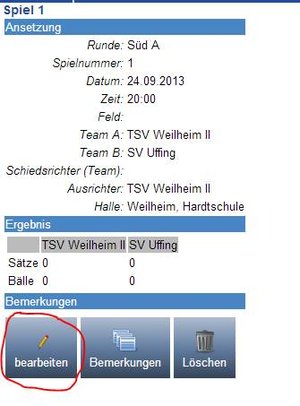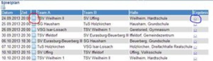 Klickt auf Symbol am Anfang der entsprechenden Zeile um Spiele zu verlegen oder auf das Symbol nach dem Team B, um ein Ergebnis einzutragen.