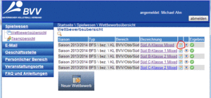 Klickt in der Navigation links auf Spielwesen. Es wird eine Liste der euch zugeordneten Ligen angezeigt.
